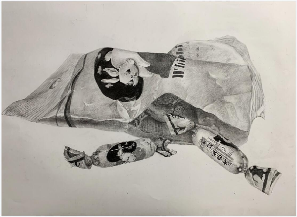 本绘画作品以大白兔奶糖为描绘对象,从整体的奶糖包装袋到散落出来的大白兔奶糖,刻画细腻且生动,追思童年幸福味道。