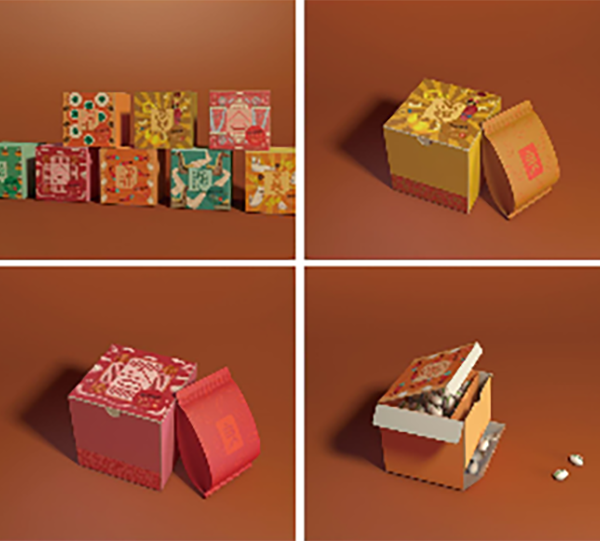 这是一组以良品铺子坚果类产品做的系列包装设计,将各类寓意相似的坚果分组并根据寓意总结出“和合如意”这四个字,将四个字以小篆字体的形式与坚果提炼出来的抽象图形做结合,图案设计主要以传统赋予寓意的事物作为元素,例如鲤鱼、龙、荷叶、财神等。在结构上,盒型以正方体为基础,对盒体内部进行设计,分隔出了盛装坚果与坚果壳的空.间,在盒体侧面设计可撕口,便于倒出坚果壳。