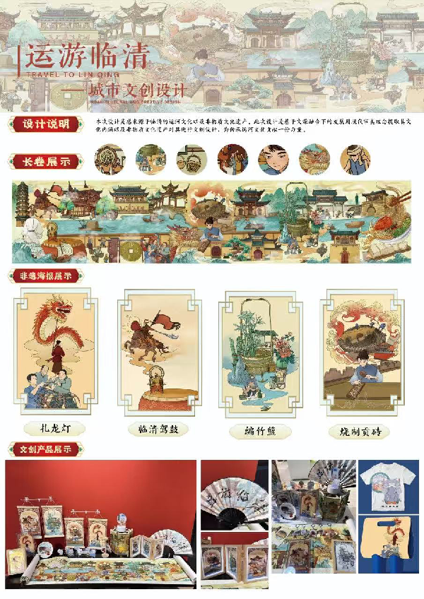 本次设计灵感来源于临清的运河文化以及非物质文化遗产。 此次设计是基于文旅融合下的大背景下,将临清的文化元素用现代审美理念提取其文化内涵以及非物质文化遗产,转化为具有吸引力和实用性的文创产品,从而为传承运河文化贡献一份力量。 |