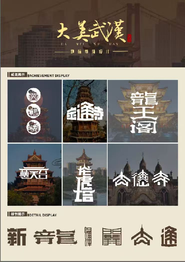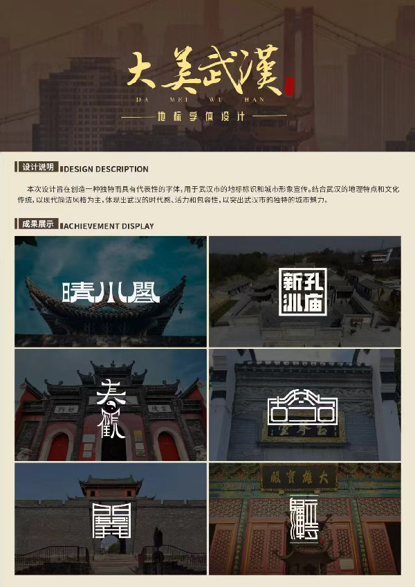 本次设计旨在创造一种独特而具有代表性的字体,用于武汉市的地标标识和城市形象宣传。结合武汉的地理特点和文化传统,以现代简洁风格为主,体现出武汉的时代感、活力和包容性,以突出武汉市的独特的城市魅力。
