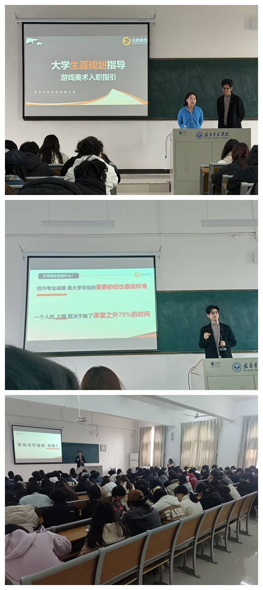 讲座特邀尔秋科技有限公司的总经理涂一龙先生担任主讲嘉宾,他紧扣艺术设计领域技术革新与市场需求变化,从专业分析、大学规划、企业招聘等三大维度展开分享。讲座以热门游戏话题开篇活跃氛围,着重倡导“优先做自己喜欢的事情”,以此来帮助广大学子更好的明确自己的职业规划与目标,同时提醒大家“切勿被专业所限制,要大胆追求心仪的工作。”涂总经理结合动画专业课程设置与行业岗位适配性分析,指出动画专业所学与游戏行业需求高度契合,重点阐释了设计类人才需具备的创新思维、审美能力、软件实操及跨界融合能力,切实搭建起专业学习与职场应用的衔接桥梁,为学子职业发展赋能引路。