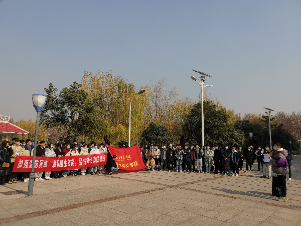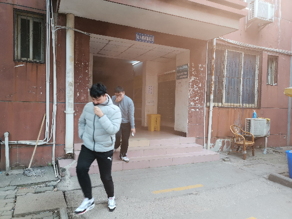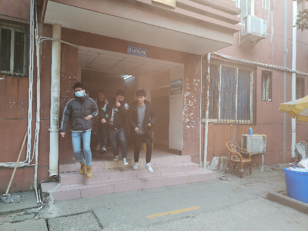 中午12点15分,随着警哨声响,南区13栋638寝室冒出浓烟,参与演习的各楼层安全员紧急吹哨,敲开寝室房门,疏散楼栋同学。3分钟内艺术院全体学生逃离“火场”,并转移到体育馆空地进行集体学习。