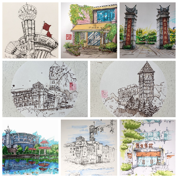 环境设计专业的同学们在写生课程中充分贴近自然,通过观察、理解和吸收,将自然造型、光影环境进行利用,并结合建筑、环境、人文将画面重构、分析、概括和提炼形成具有创意的速写和色彩作品。