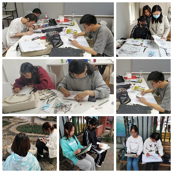 《外出写生》作为艺术学科学生设计基础养成的集中性实践环节课程,旨在培养学生通过画面摹写以及色彩表现的技法来构造美的形成。课程教学中老师们指导学生通过速写写生、摄影练习、构图练习等单元训练,掌握客观物象形、色、光的表现规律,学会从更多方位去观察、认识和理解客观物象。同时在思想上引导学生认识并正确分析社会发展对环境变化的作用,让学生理解历史传承的重要性,建立文化自信。