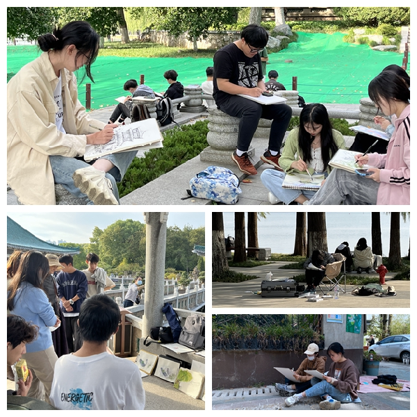 下午所有人紧接着观访东湖听涛风景区,胡院长对同学们的绘画作品给予了肯定。大家通过写生创作实践获得的灵感,更体现了同学们独特的艺术视角和表达形式,为大家综合素质和专业技能的提高打下了基础,达到了预期的教学效果。专业老师们系统的从构图起形-用笔调色-细节刻画-画面完善,逐步示范讲解,同学们很快就能进入状态,跟着老师的讲解一步步的完成。通过户外课程可以更好的理解绘画的光影和色彩原理,大自然就是最好的范画,从上午的九点到下午的三四点,光影流动中感受色彩的冷暖变化,用笔的概括,以及切实的观察方式。