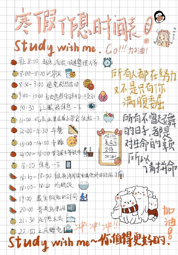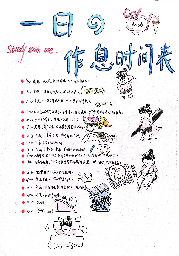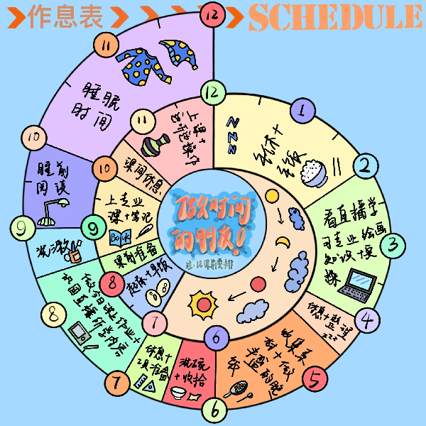 在学业篇主题活动中,学院精心策划“做时间的朋友”每日作息时间表评比大赛,鼓励学生合理安排时间,高效学习,促进学有所获。从“时间规划科学;设计精美;实用性强;能够充分反应作息情况;具有示范性;内容全面且能够促进学习”六个方面进行评分。经过同学们的合理规划和精心设计,最终视传2003陶应龙获得一等奖;产品2102聂奕纯、设计类2208刘若斐、动画2201胡佳、动画2202徐凯杰获得二等奖;动画2202张钰晗、视传2003朱晓杰、设计类2208张盼盼、视传2004刘梅娟、动画2202程子洲获得三等奖。陶应龙在参加活动后总结到经过这次学业类作息表的制作,自己认真规划了假期时间表,认真执行时间表上所写的每一条计划,希望自己在未来继续保持,脚踏实地走好每一步,做时间的主人。徐凯杰在参加活动后表示,经过这次学业作息表的制作,丰富了自己的假期生活,也提高了自己的学习意识。让自己在寒假里保持良好的学习习惯,为开学后的学习打下良好的基础。