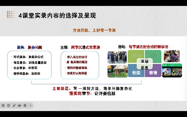 课堂实录内容的选择及呈现,聚焦于将创新实践的教学过程呈现出来,同时,选择与内容紧密匹配的沉浸式教学法,如游戏活动、问题链、虚拟现实等,让学生在身临其境中深化理解,提升学习兴趣和效果,从而全面呈现创新实践的教学魅力。