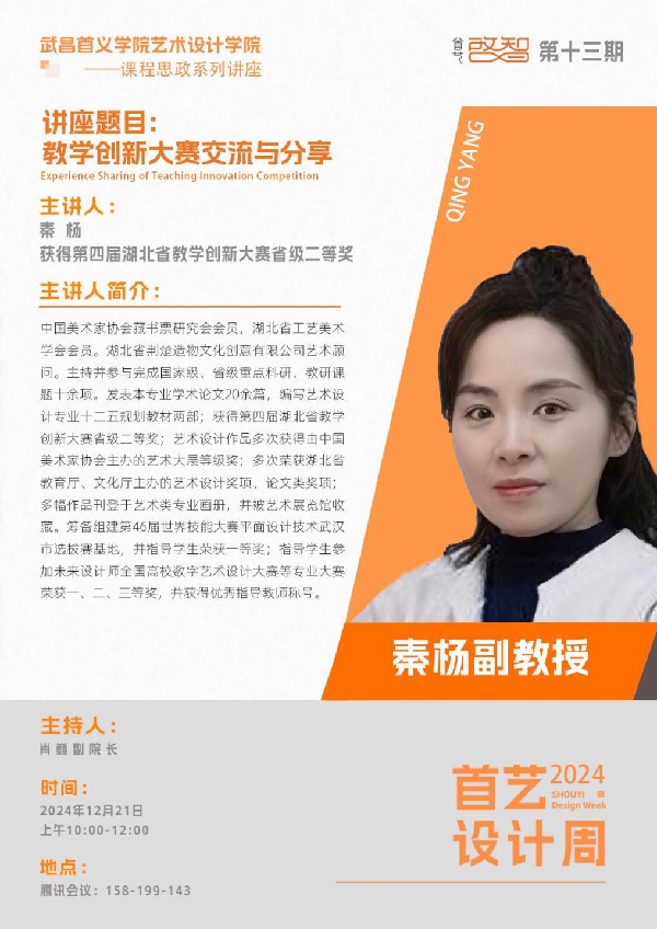 12月21日上午,艺术设计学院秦杨副教授,围绕《教学创新大赛交流与分享》作线上专题讲座。讲座由艺术设计学院副院长肖巍主持。