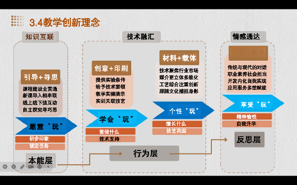 本次教学创新设计大赛紧密结合《文创设计实践》专业课程,遵循“创新+文化=技术工艺+综合发展”的文创设计与制作,围绕课程定位、学情分析、锁定痛点问题进行深入分析、整合,重塑教学目标,采取教育理念与实践中的三个重要方面:“知识互联、技术融汇、情感通达”,它们相互关联,共同构成了以学生为中心的教学环境的基石,促进学生逐步实现从本能层、行为层、反思层的开发内化的教学创新举措。并在教学内容的实施过程中,打造沉浸式工坊并实现“教、学、做”一体化,通过实践操作和反思总结,学生可以更深入地理解理论知识,学以致用、将知识内化升华。在课程成绩评定方式上,结合“课前基础、课中实操、课后终结、实验拓展、成果服务”多个维度的评定标准,制定了全面且细致的评定体系,强化了评定体系的全面性和准确性。