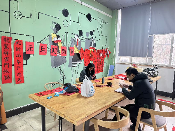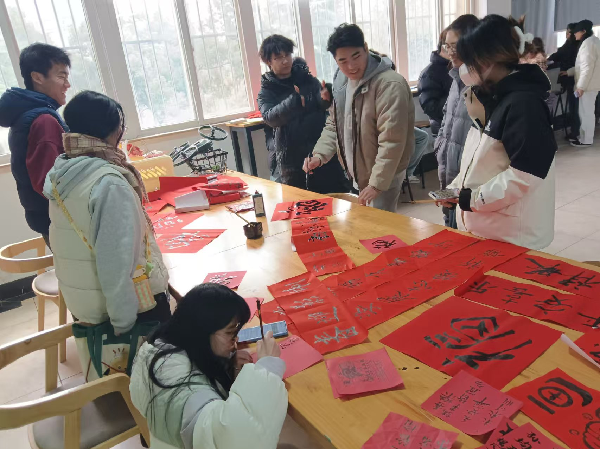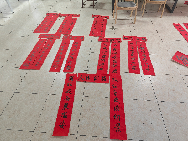 活动前期,艺术设计学院分团委学生会的同学们明确分工,充分准备,精心布置了此次的活动场地,在艺术设计学院二楼迎接着参与活动的同学和老师们。同学们发挥自身艺术特长,写上大大的“福”字,有与2024、2025结合的;有与“蛇”年结合的,一笔一画书写着同学们对生活的热爱。还有书法爱好者张钰老师前来“捧场”,将人名与美好的寓意结合在一起,写出了一幅幅充满着“爱”的对联。最后,参与活动的同学和老师们还能抽取一个小奖品,抽出“双黄蛋”的人都相当喜悦。