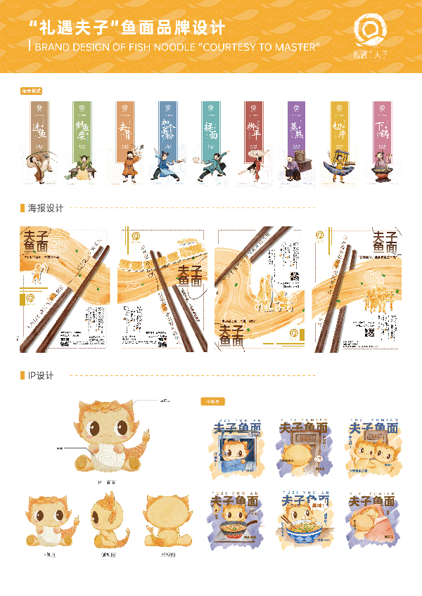“礼遇夫子”是以湖北麻城特色美食鱼面为主题打造的土特产品牌设计。项目源于我童年对鱼面的美好记忆,整体以水彩插画为表现手法,采用温润的黄色系色调,呼应夫子河鱼面的奶黄本色,营造亲切自然的品牌气质。设计内容涵盖标志、插画、海报等,旨在融合地域文化与现代视觉语言,构建具有地方特色与情感温度的品牌形象,为传统美食注入新的生命力。 |
