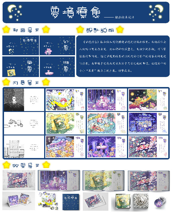 《梦境疗愈》插画绘本设计围绕梦境进行插画绘制。从现代社会人们的心里层面出发,比如精神世界匮之,生活空间压抑,时间紧张压迫等问题,通过梦境里的美好以对现实世界中的痛苦与问题进行疗愈,在梦境中完成在现实生活中无法完成的事情,让现实中的小小“配角”做自己的主角,好梦成真。