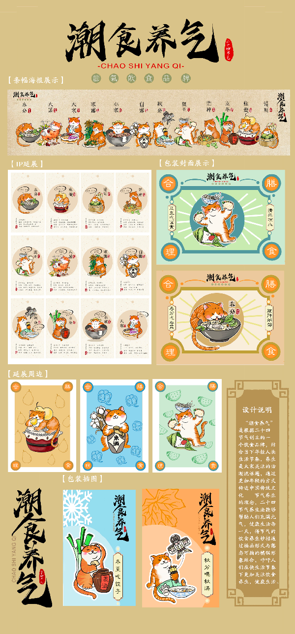 “潮食养气”是针对二十四节气饮食的品牌形象设计。随着快生活的节奏,养生成为一种潮流趋势,此作品针对中国传统文化的节气养生来展开,“气”不仅是生机活力之意,更旨在传承二十四节气的食疗养生法。品牌IP为一只胖乎乎贪吃的橘猫形象,将猫的形象与各节气适宜的食物通过插画的方式展现,并运用到一些餐具、用具等产品上,旨在将传统文化用以中国更为生动、有趣的方式传承下来。