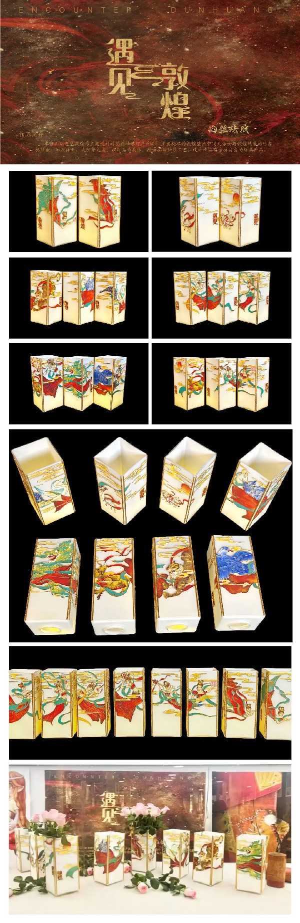 本作品是以遇见敦煌为主题设计的掐丝珐琅灯具产品,主要将提取的敦煌壁画中飞天仙女与敦煌瑞兽的形象相结合,加入祥云、太阳等吉祥元素,以灯具为载体,结合掐丝珐琅工艺,设计出的具有吉祥寓意的灯具产品。