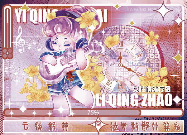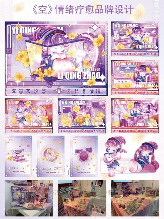 关于《空》品牌设计,通过分析女性在生活中的三种焦虑情绪,婚姻焦虑,容貌焦虑和工作焦虑分别绘制两张插画,代表了疗愈前后的变化。整体故事结合李清照设计的任务IP,将现代元素融入IP设计中,并且在插画里加入金文篆体并配上诗词。整体色彩上以紫色,红色为主,给人视觉上的冲击力和区分。将传统人物经过现代化的创造,打造传统美与现代潮流的碰撞打破受众对于传统人物刻板的印象,突破更新视觉效果,使人们产生情感的共鸣。