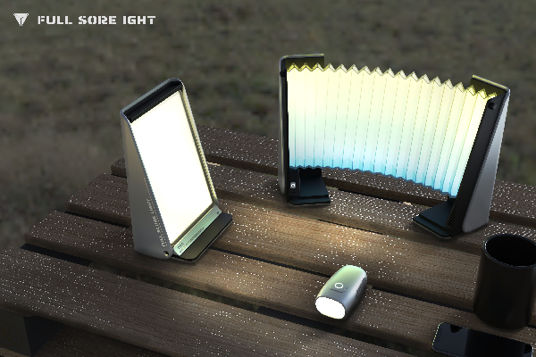 为露营场景设计的模块化组合灯具。以手持灯、营地灯、氛围灯三种灯具作为产品的三个基本组成单元。通过各个单元模块之间的组合形成产品的包装外壳,包装即产品,避免不必要的包装浪费。