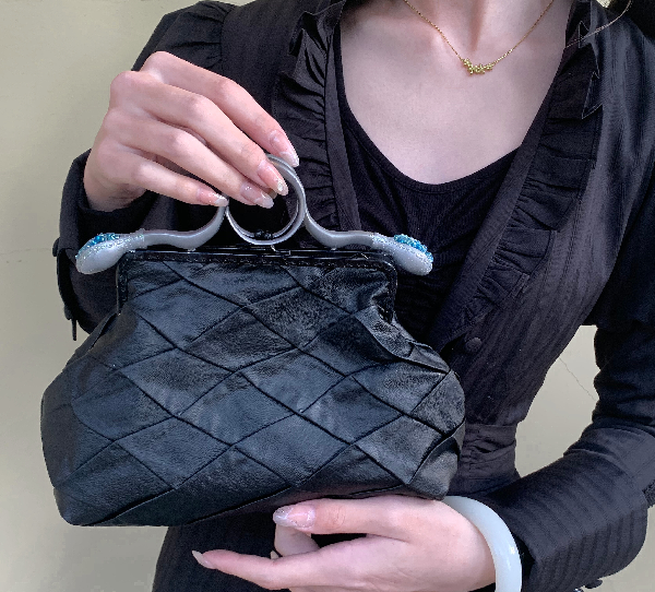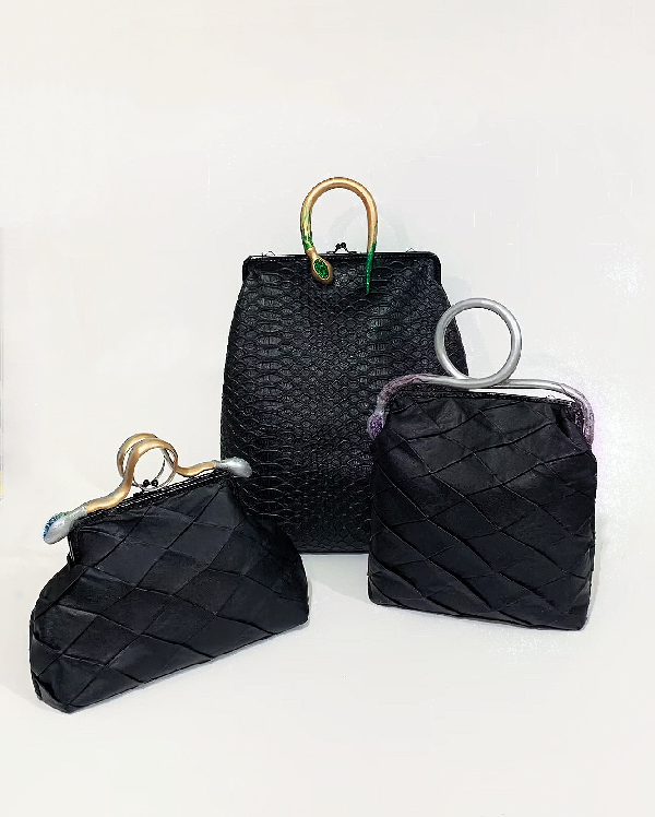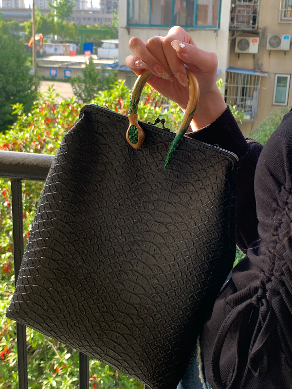 本作品是以生肖蛇的蜿蜒姿态为灵感设计的小众风格女包。黑色的皮质包体选取口金包为基本型,融入蛇的造型作为把手,饰以彩色水钻、彩绘和金银色粉,形成强烈的审美体验,复古、华丽而时尚。
