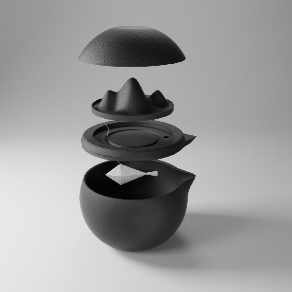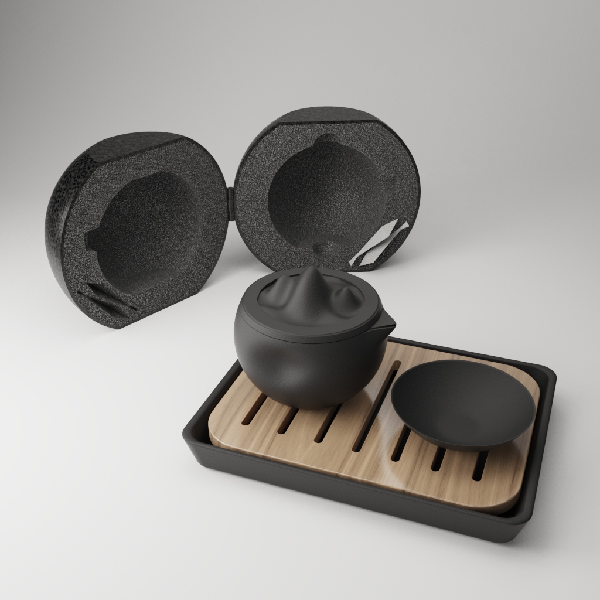 此产品是针对青年人群设计的一款户外便携式茶具。整体采用茶包茶具套盒形式。茶包采用盲盒形式,增添了饮茶情趣外,鱼型茶包也能给使用者带来鱼儿在水里游动的视觉体验。旋转壶盖山体部分可以控制茶包与茶水的分离和融合。