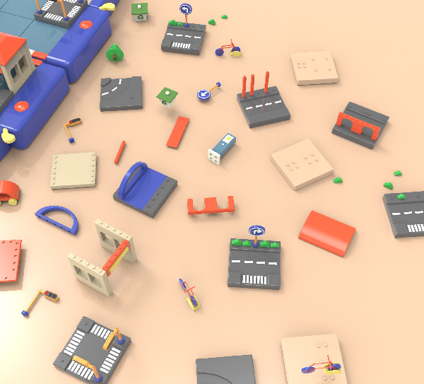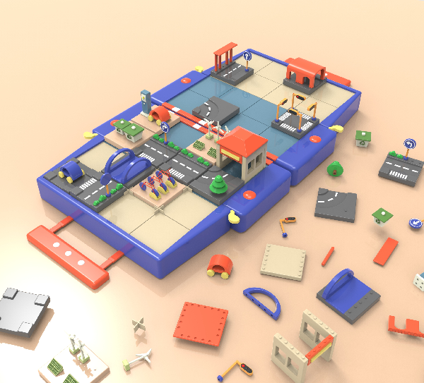 该玩具针对3-6岁儿童,采用模块化的设计方式。以认知最基本的交通知识为出发点,将其融入游戏全过程,让儿童按照流程行事,从探索玩具的过程中学习交通知识并逐步建立遵守交通规则的意识,从而锻炼儿童的空间想象力、规划能力、专注力和图形思维能力。