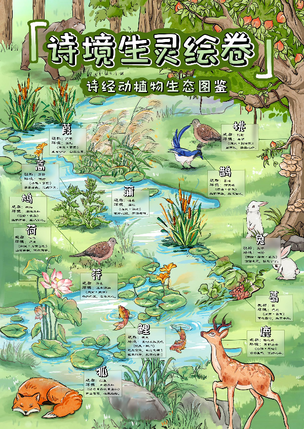 本设计以《诗经》中的动植物为元素,通过信息可视化手法,将古典文化与现代审美相结合。图表以简洁的线条和鲜明的色彩,展现诗经中的自然生态,旨在传承古典文化,让人们更直观地感受古代诗歌中的自然之美。