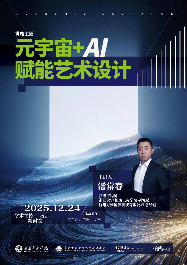 2025年12月24日,艺术设计学院举办“元宇宙+ AI赋能艺术设计”专题讲座。讲座由院长胡雨霞教授主持,特邀浙江大学谭建荣院士团队潘常春研究员、湖北省机械工程学会副秘书长揭英诚来校交流,学院教师到场聆听,共同关注数智技术背景下艺术设计教育的变革趋势与实践路径。