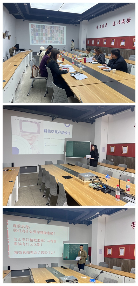 在测试环节,三位申请人员准备充分,结合多媒体课件展示了扎实的专业功底与独特的教学风格。视觉传达设计专业的黄慕晗老师首先登台,她带来的《构成设计》第一讲,从平面构成的基础理论出发,将抽象的线条与空间逻辑条理清晰地呈现出来,为课程奠定了良好的开端;视觉传达设计专业的孙佳童老师随后进行了《基础素描-精微素描专题》的试讲,他通过生动的案例分析和细腻的技法讲解,展示了如何在写实绘画中通过光影细节捕捉物体的生命力。产品设计专业的姚希老师则聚焦前沿领域,试讲了《智能交互产品设计》中关于“交互设计概念”的内容。她从人机互动的逻辑演变切入,深入浅出地阐述了交互设计的核心要义,体现了跨学科视野。三位教师在规定时间内圆满完成了教学演示,充分展现了青年教师的蓬勃朝气。